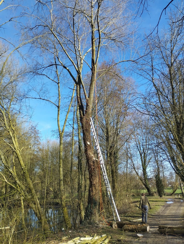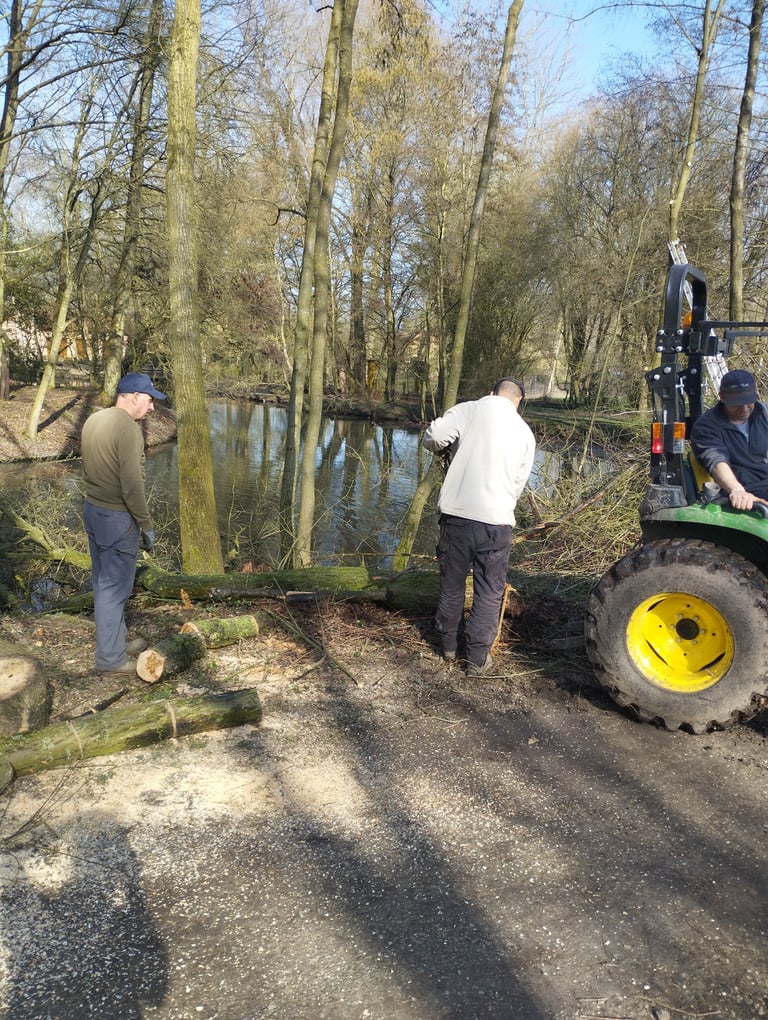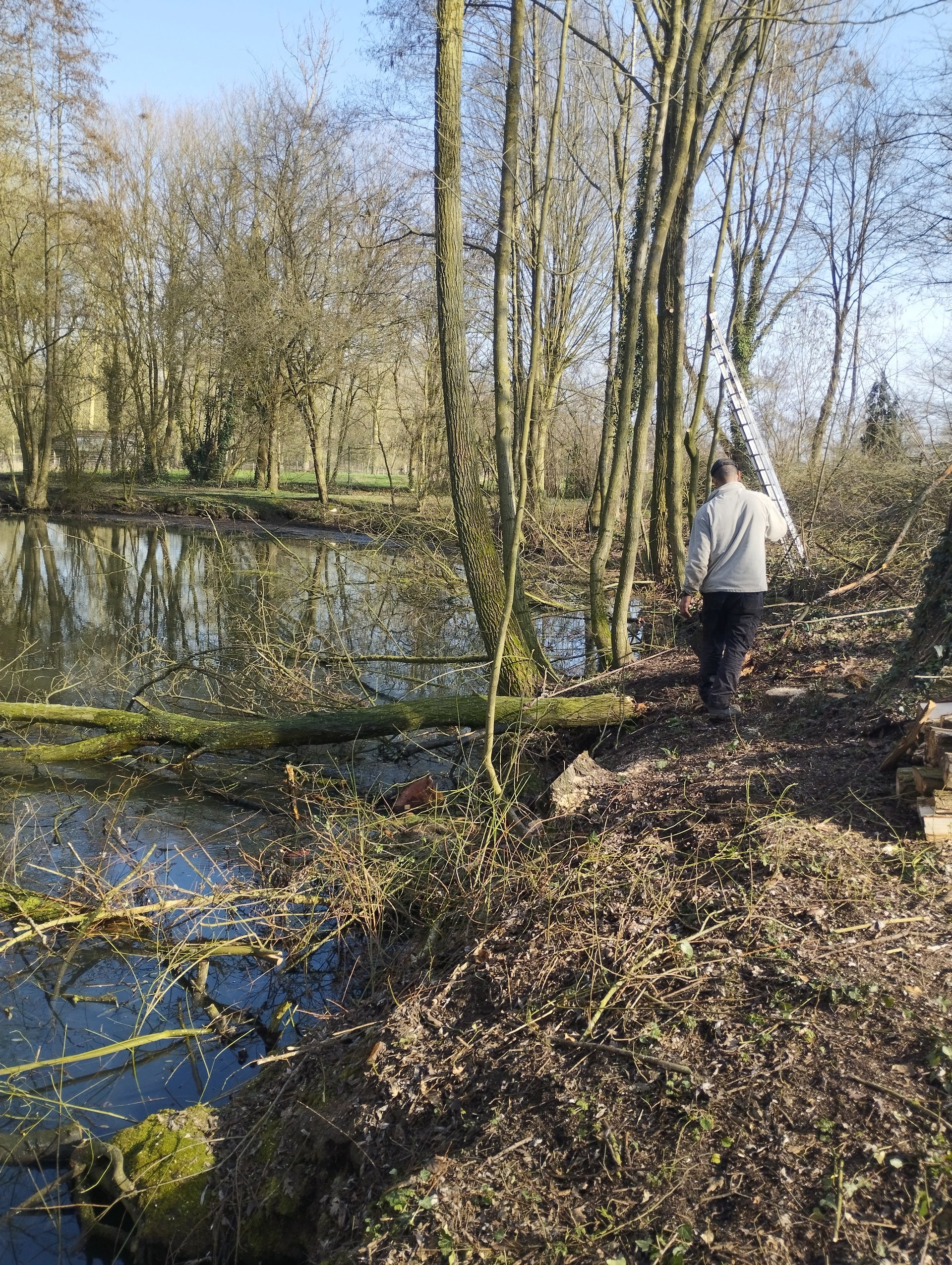 Extraction et enlèvement d'un arbre tombé dans un étang.
