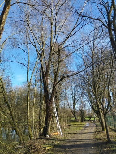 Élagage de branches endommagées et dangereuses au dessus d'un chemin de parc.